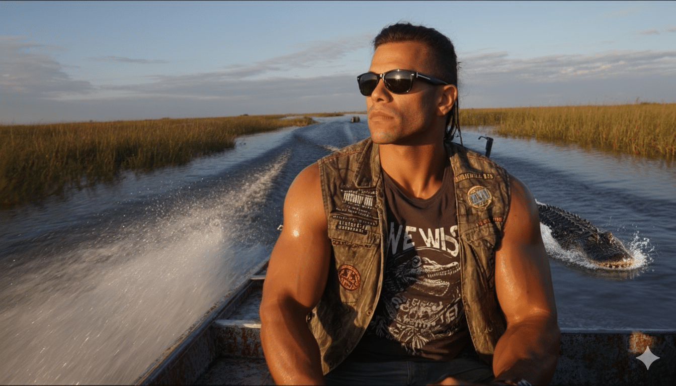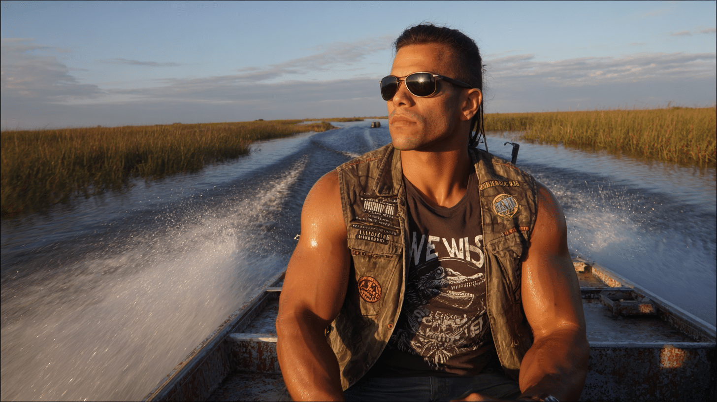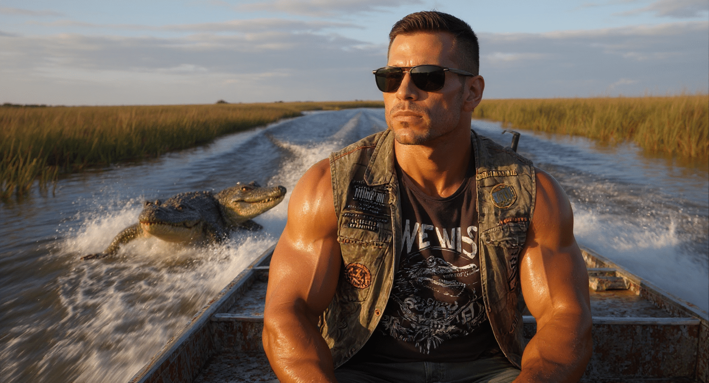 Prompt: Change the sunglasses to Tom Ford sunglasses, add an alligator chasing the boat in the background, make the main character more muscular and ripped, and change his hair to be shorter. Make the picture more realistic
